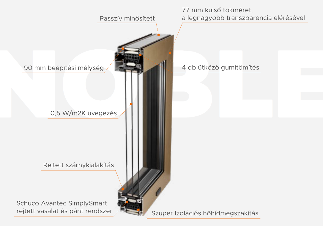 • Schüco 7 kamrás profilrendszer optimalizált hőszigetelési tulajdonságokkal, megfelelő üvegezéssel akár 0,75 W/m2K Uw-értékig